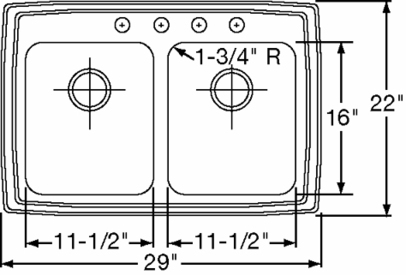 Product Details: Installation Type: Top Mount Material: Stainless Steel Finish: Stainless Steel Thickness: 18 Gauge Sound Deadening: Full Spray Number of Bowls: 2 Minimum Cabinet Size: 33" Sink Dimensions: L: 29" W: 22" Primary Bowl Depth: Please Choose Both Bowl Dim.: 11 1/2'' x 16'' x 4'' Faucet Holes: Please Choose Drain Size: 3 1/2" Code Compliance: ADA ADA, IAPMO