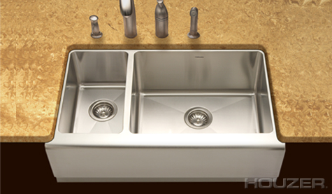 Farmhouse sink, 16/18 gauge, Undermount or Flushmount, 10 high apron with 2 offset, 3 return on all sides, Scored bottom,